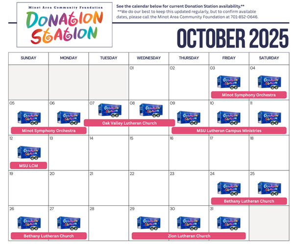 calendar below as a planning guide. Calendar is updated weekly, but we recommend calling the Minot Area Community Foundation to confirm availability. Reservations are made on a first-come, first-served basis, and the Donation Station will not be booked for more than one week to allow as many organizations as possible to participate. Don’t forget to check the