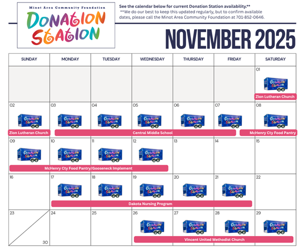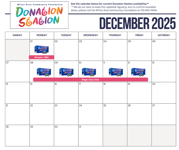 calendar below as a planning guide. Calendar is updated weekly, but we recommend calling the Minot Area Community Foundation to confirm availability. Reservations are made on a first-come, first-served basis, and the Donation Station will not be booked for more than one week to allow as many organizations as possible to participate. Don’t forget to check the